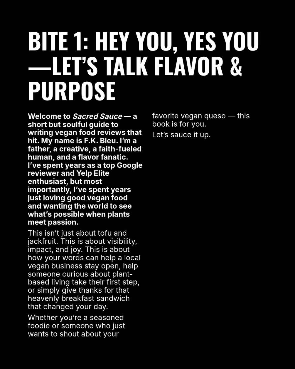 Sacred Sauce is a short, soulful crash course for anyone who wants to start writing vegan food reviews with more flavor, more impact, and more confidence — whether it’s on Google, Yelp, Instagram, or TikTok.