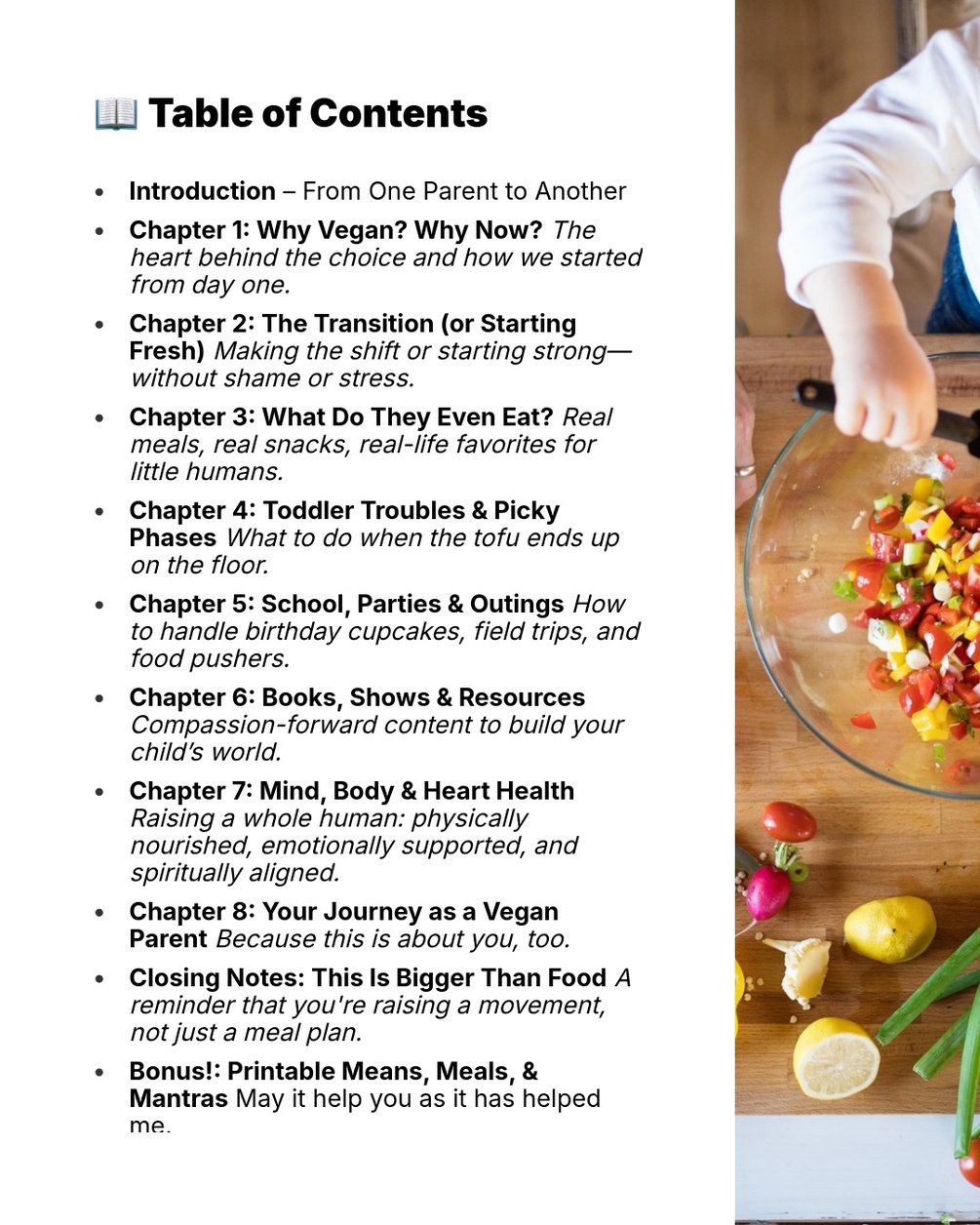 You’ll find insights, encouragement, and easy tips for everyday life—from grocery stores to family dinners to birthday parties. Whether you're new to vegan parenting or feeling isolated in the journey, this 34-page guide was written to remind you that you’re not alone.