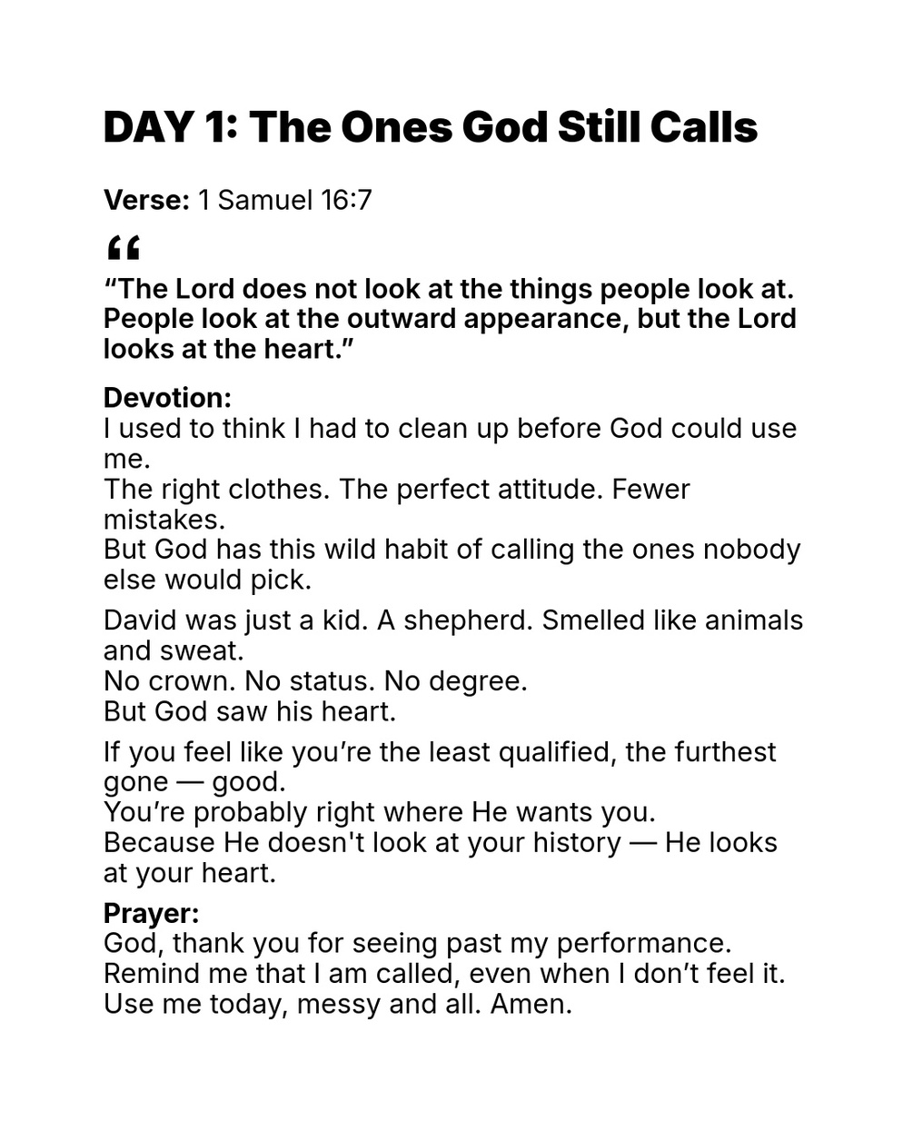5 raw, hope-filled devotionals Scripture + honest reflections Simple prayers for the ones still hanging on A reminder that you’re not too far gone — you’re called