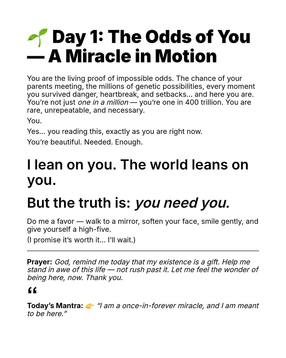 💛 Daily encouragement for when you're overwhelmed 🧘♀️ Simple mantras to reset your mindset 🙏 Prayers to connect spiritually (or just soak in good energy) ⏳ Only 10 pages — easy to read, powerful to feel 🌅 A pocket-sized reset to leave you better than it found you