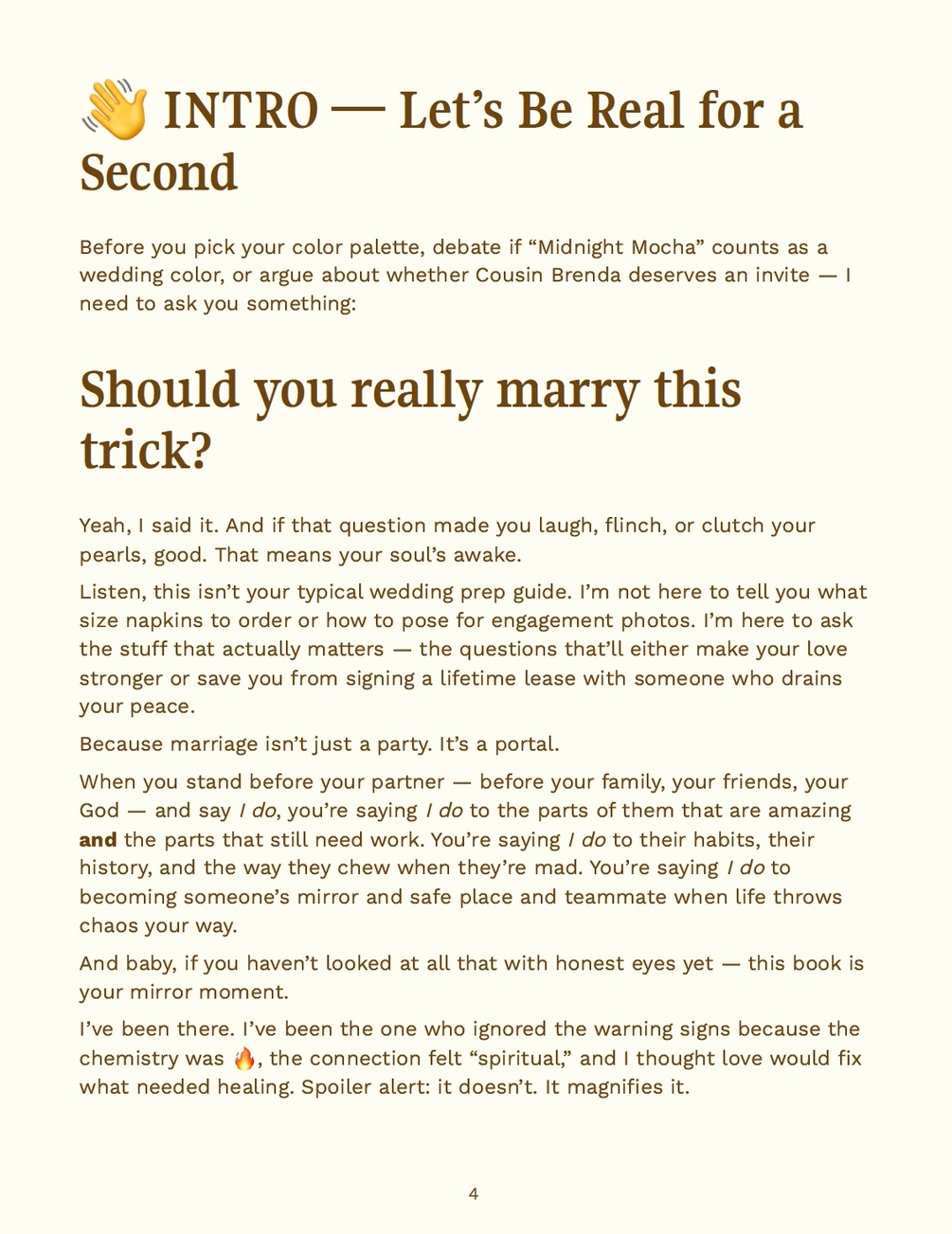 This isn’t your momma’s premarital workbook. It’s part humor, part healing, and all honesty — written for couples, singles, and Sacred Rebels who love deeply but are ready to choose wisely.