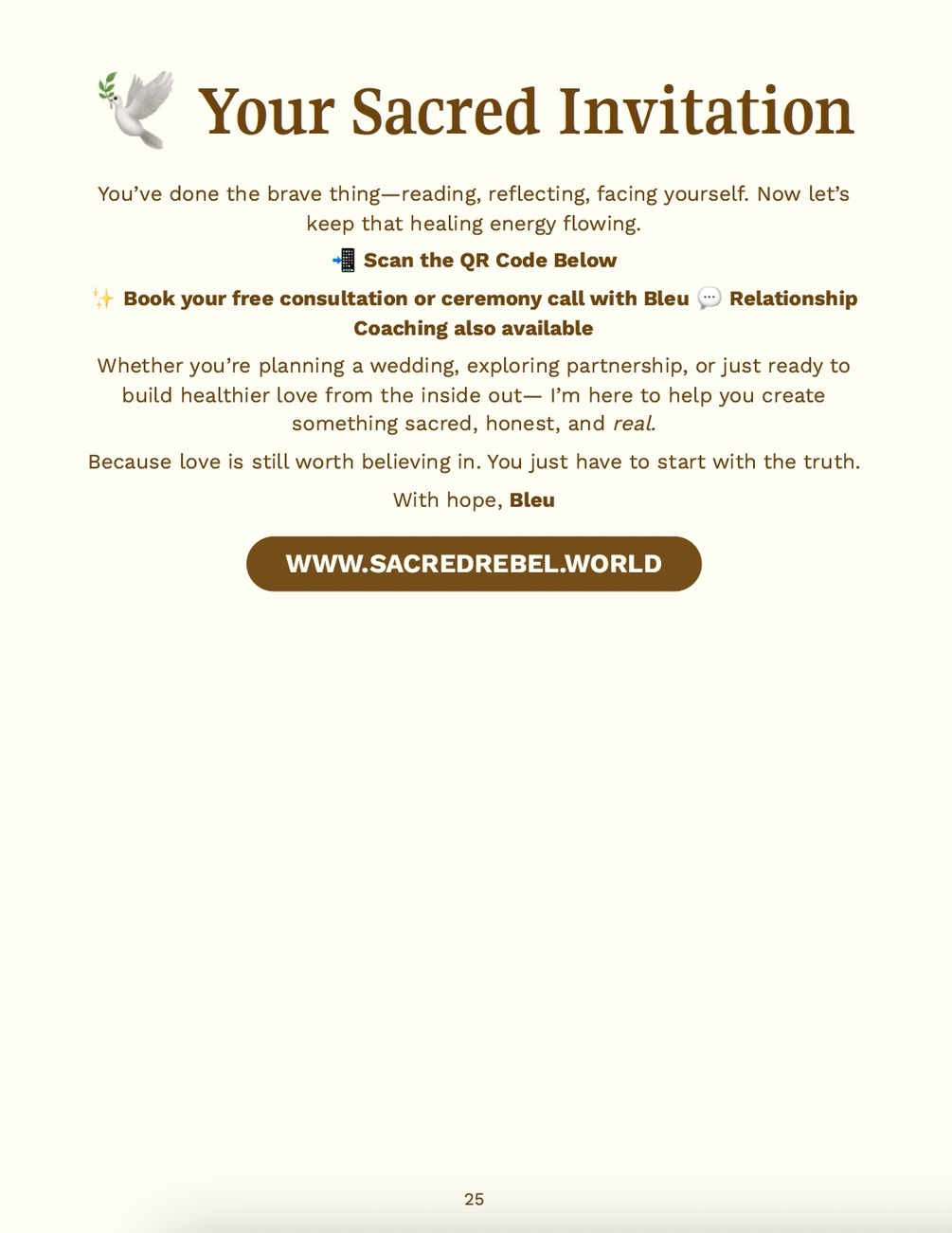 ✨ Includes: Full eBook (PDF download) Bonus: Journal prompts, mini blessings, and sacred reflections QR space for free consultation & relationship coaching 📲 Format: PDF 🕊️ Length: 26 pages 💛 Tone: Hopeful. Hilarious. Holy. Human.